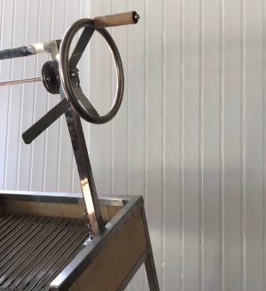 כולל הגה מנואלה , ידית עץ ,גלגלי שיניים + רצ'ט להרמת משטח צלייה למצבי גובה לפי הצורך . כולל תעלת איסוף שומן , מגש תחתון וגלגלים עם מעצור .